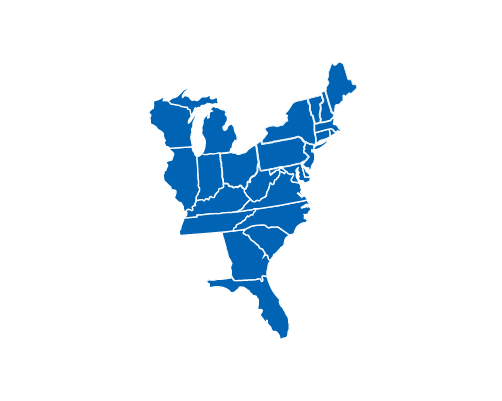 Connecticut, Delaware, Florida, Georgia, Illinois, Indiana, Kentucky, Maine, Maryland, Massachusetts, Michigan, New Hampshire, New Jersey, New York, North Carolina, Ohio, Pennsylvania, Rhode Island, South Carolina, Tennessee, Vermont, Virginia, Washington D.C, Wisconsin, and West Virginia